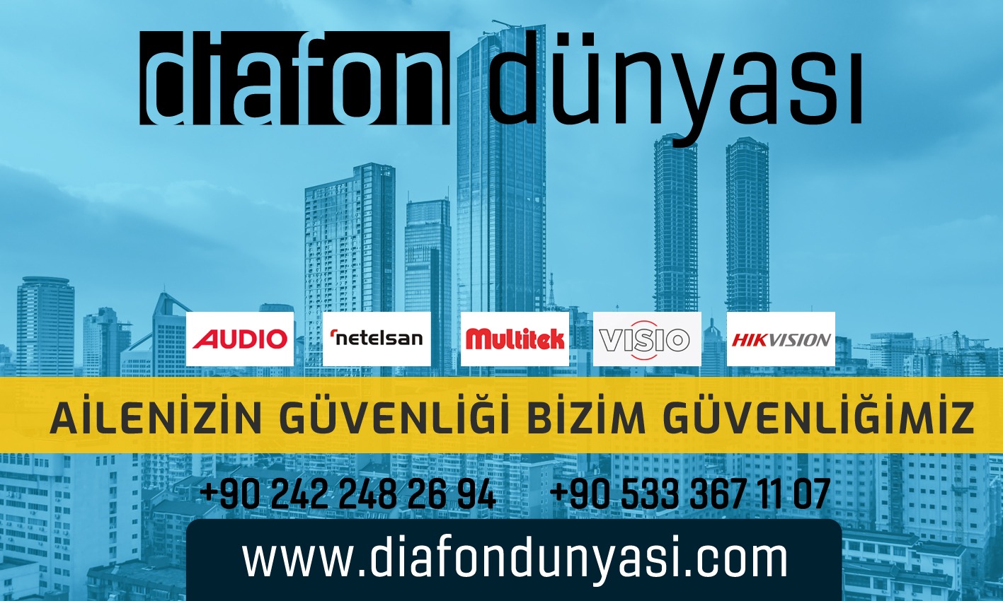 Diafon Dünyası Antalya olarak, kaliteli ve güvenilir diafon sistemleri ile evlerinizi ve işyerlerinizi daha güvenli hale getiriyoruz. Uzman ekibimizle, ev ya da iş yerleriniz için ihtiyacınıza uygun diafon sistemleri sunuyor ve kurulum hizmeti veriyoruz. Sesli ve görüntülü diafon sistemleri ile misafirlerinizi kolayca tanıyın, güvenliğinizi arttırın. Antalyanın her bölgesine hızlı ve kaliteli hizmet sunuyor, müşteri memnuniyetini ön planda tutuyoruz. Diafon sistemleri ile ilgili sorularınız ve talepleriniz için bizimle iletişime geçebilirsiniz. Uygun fiyat, yüksek kalite ve mükemmel hizmet için Diafon Dünyası Antalyayı tercih edin.
